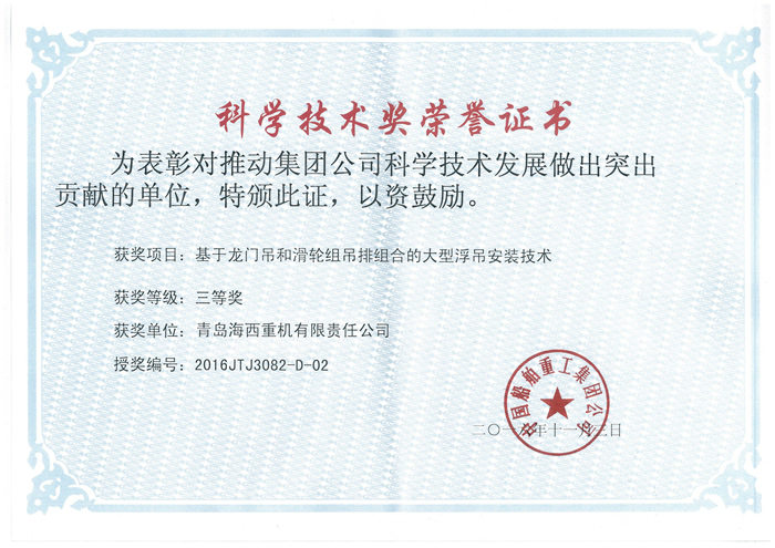 近日,集團(tuán)公司再傳喜訊,海西重機(jī)《基于龍門(mén)吊和滑輪組吊排組合的大型浮吊安裝技術(shù)》榮獲中國(guó)船舶重工集團(tuán)公司2016年度科學(xué)技術(shù)三等獎(jiǎng),科技研發(fā)再下一城,創(chuàng)新成果錦上添花。
