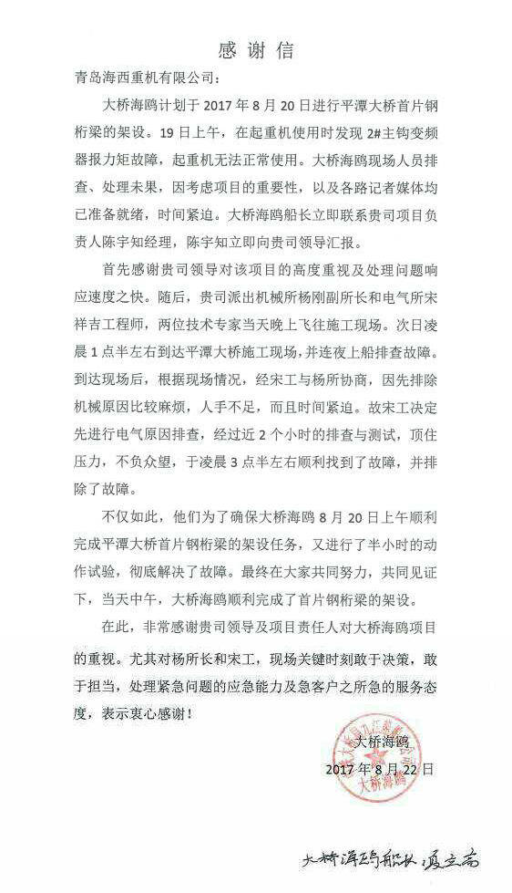 自今年年初設(shè)備交付以來,海西重機(jī)定期安排技術(shù)人員進(jìn)行回訪,協(xié)助業(yè)主方對設(shè)備進(jìn)行檢查和保養(yǎng),及時處理故障,保證設(shè)備高效運作,有力地保障了現(xiàn)場施工的可靠性和穩(wěn)定性,海西重機(jī)工作人員負(fù)責(zé)、用心的工作態(tài)度和完善的售后服務(wù)得到了業(yè)主方的一致好評,業(yè)主特發(fā)來感謝信給予表揚(yáng)。