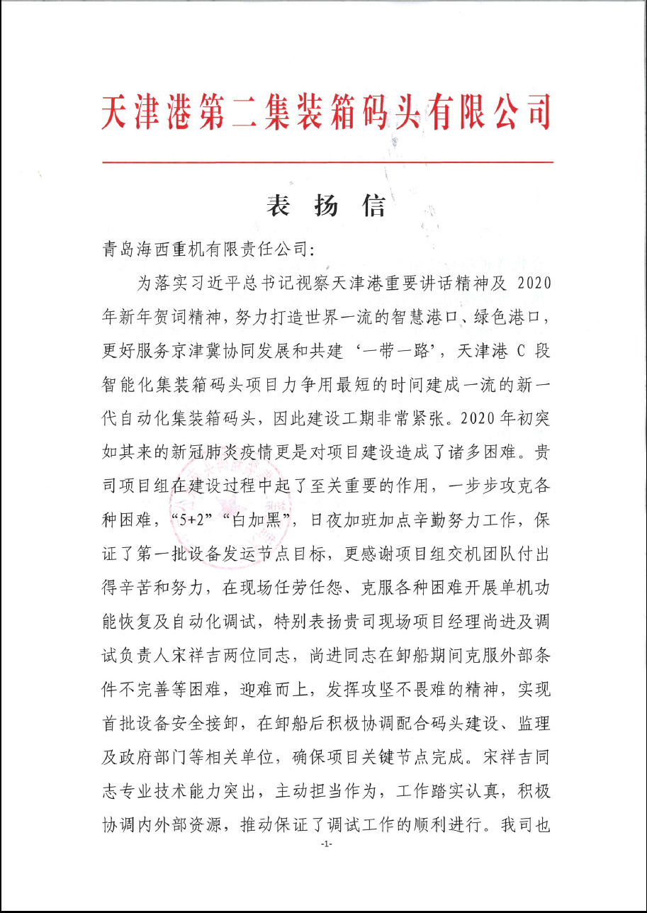 該項(xiàng)目第一批設(shè)備的發(fā)運(yùn)正值彼時(shí)天津疫情嚴(yán)重之際,海西重機(jī)項(xiàng)目組交機(jī)團(tuán)隊(duì)更是不畏艱難,勇于擔(dān)當(dāng)作為,馬上奔赴新的戰(zhàn)場(chǎng)。用戶在表?yè)P(yáng)信中,特別表?yè)P(yáng)了海西重機(jī)現(xiàn)場(chǎng)項(xiàng)目經(jīng)理尚進(jìn)和調(diào)試負(fù)責(zé)人宋祥吉。尚進(jìn)同志在卸船期間克服外部條件不完善等困難,迎難而上,發(fā)揮攻堅(jiān)無(wú)畏的精神,實(shí)現(xiàn)首批設(shè)備安全裝卸,在卸船后又積極配合碼頭建設(shè)、監(jiān)理及政府部門(mén)等相關(guān)單位,力保項(xiàng)目關(guān)鍵節(jié)點(diǎn)的完成。