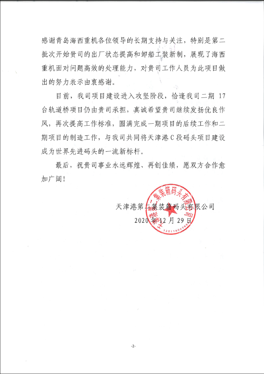 日前,中國(guó)船舶集團(tuán)旗下武漢船機(jī)海西重機(jī)公司收到天津港第二集裝箱碼頭有限公司的表?yè)P(yáng)信,字里行間表達(dá)出了用戶對(duì)海西重機(jī)在重大節(jié)點(diǎn)中勇于擔(dān)當(dāng),精誠(chéng)合作,辛勤努力的肯定與感謝。