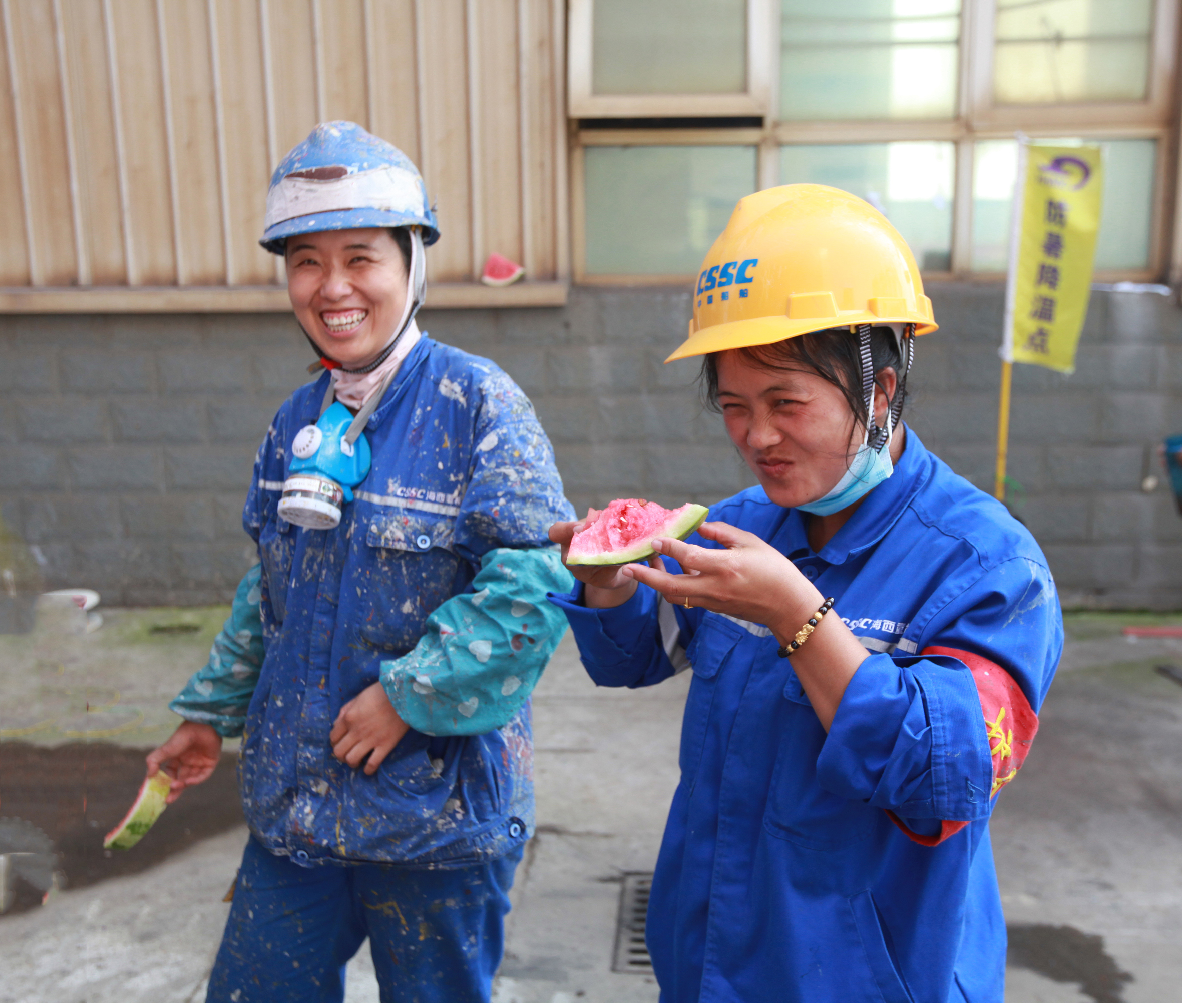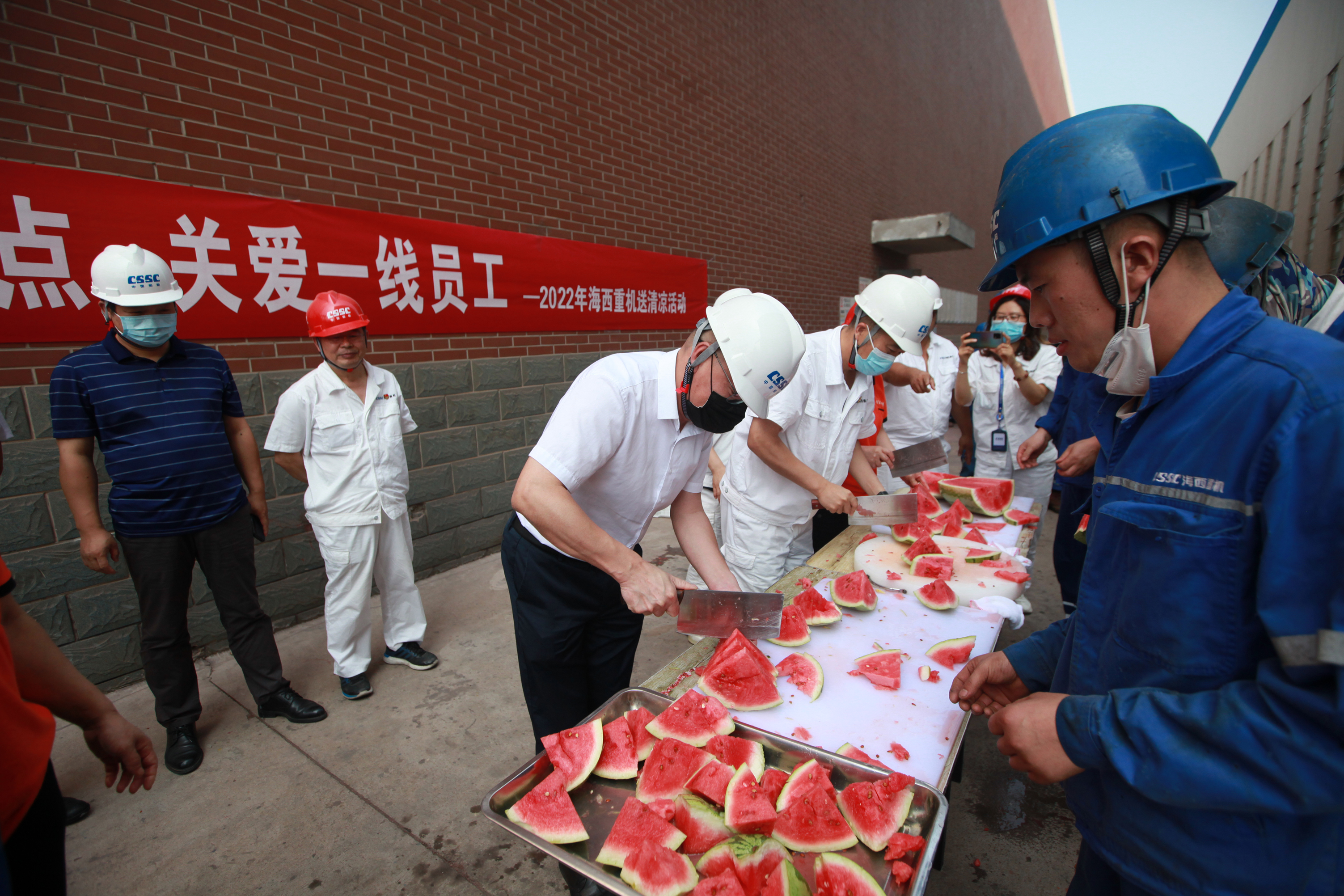 武漢船機(jī)總會計師、工會主席陳世龍,海西重機(jī)黨委副書記、紀(jì)委書記、工會主席朱聲凱等到生產(chǎn)現(xiàn)場開展慰問,為大家送上了鮮甜解暑的西瓜,對現(xiàn)場一線員工的辛勤付出表示感謝,叮囑大家高溫高濕天氣下要加強(qiáng)自我保護(hù),合理安排作息,確保平安度夏。