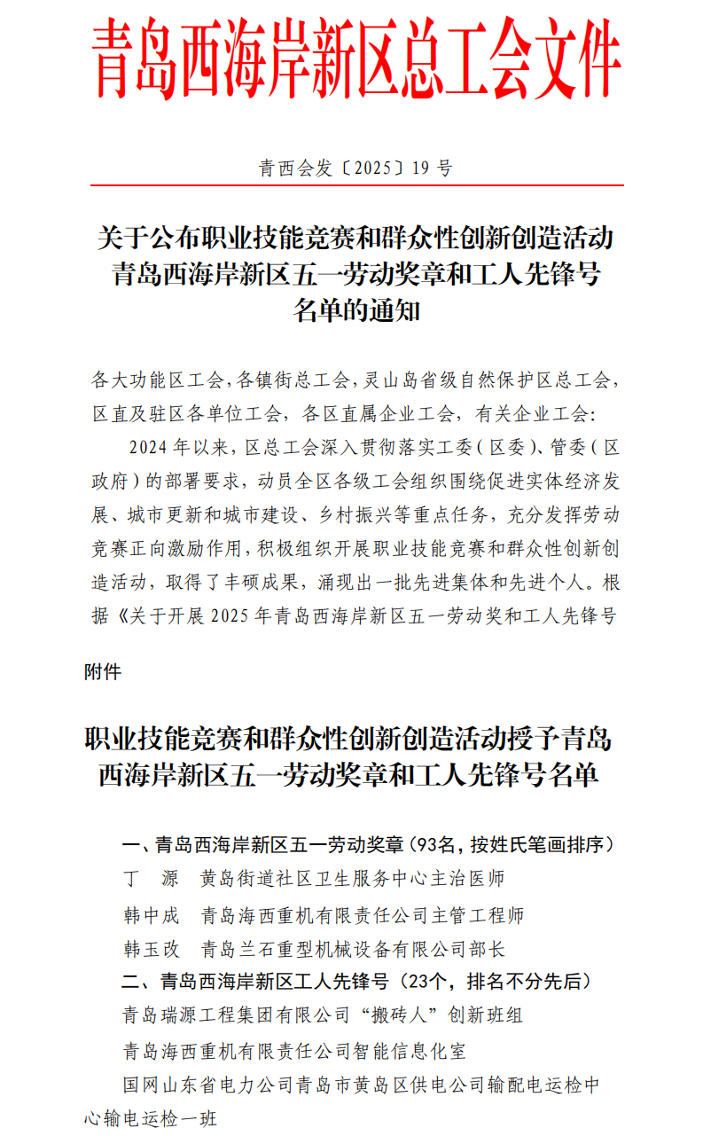 近日,海西重機(jī)智能信息化室榮獲西海岸新區(qū)“工人先鋒號”稱號,主管工程師韓中成榮獲西海岸新區(qū)“五一勞動(dòng)獎(jiǎng)?wù)隆?。這一雙項(xiàng)殊榮的取得,既是對公司堅(jiān)持創(chuàng)新驅(qū)動(dòng)發(fā)展的認(rèn)可,更是對新時(shí)代產(chǎn)業(yè)工人矢志技術(shù)報(bào)國的褒獎(jiǎng)。