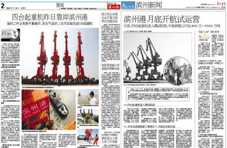 我公司為濱州港務(wù)有限責(zé)任公司承制的4臺(tái)MQ2533門座起重機(jī)于2012年7月10日運(yùn)抵濱州港碼頭后,引起了當(dāng)?shù)卣鐦O大關(guān)注。濱州市委書(shū)記、濱州市長(zhǎng)辦公室、濱州市委組織部、濱州市海事局、濱州市公安局、以及各縣區(qū)級(jí)領(lǐng)導(dǎo),先后到碼頭進(jìn)行參觀指導(dǎo),濱州日?qǐng)?bào)、魯北晚報(bào)更是多次到碼頭進(jìn)行采訪報(bào)道。