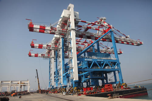 這次滾裝的三臺(tái)設(shè)備中,1500T/H卸船機(jī)是為華能(福建)海港公司研制的大型卸船機(jī)(共三臺(tái));兩臺(tái)MQ2535門機(jī)是為中國重要深水港口之一,西南部第一大港——廣西防城港生產(chǎn)的首批(共七臺(tái))門座起重機(jī)。這次三臺(tái)大型港機(jī)在同一天內(nèi)整機(jī)順利滾裝成功,再次驗(yàn)證了公司設(shè)計(jì)水平、制造工藝、組織能力和海綁捆扎工藝的成熟性,也標(biāo)志著武漢船機(jī)投資的青島海西重機(jī)經(jīng)過了近7年的從規(guī)劃、建設(shè)到邊建設(shè)、邊生產(chǎn)步入到成熟的批量化生產(chǎn)港口設(shè)備階段。為青島海西重機(jī)的最終目標(biāo):成為“中國最具競爭力的港口裝備、設(shè)備企業(yè)”邁出了堅(jiān)實(shí)的一大步。