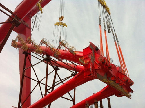 經(jīng)過一天的準備,整個人字架翻身過程有條不紊:起鉤、落鉤、制動、割余量,再起鉤、落鉤、翻身、加固、摘鉤,一氣呵成。在1600T龍門吊上下小車配合下,在我部統(tǒng)籌指揮下,各部門協(xié)同作戰(zhàn),歷時僅4小時,500T人字架順利翻身,1600T龍門吊投產(chǎn)以來首戰(zhàn)告捷。