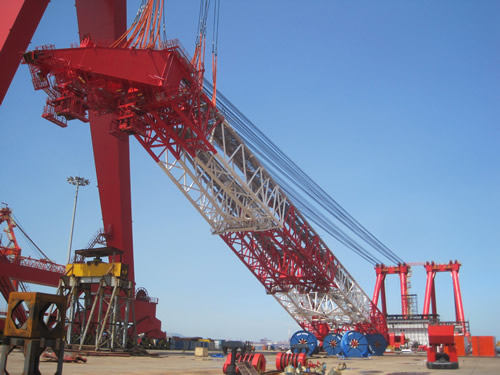 8月18日下午,青島海西重機在自己的突堤碼頭內(nèi)順利完成3600t浮吊1#臂架的最后吊裝。至此,3600t浮吊臂架安裝、鋼絲繩纏繞、臂架拉起的三步驟吊裝均已勝利完工。該臂架總重1200T,長130M,寬24米,高10米,是典型超長、超大、超重件,通過對國內(nèi)首創(chuàng)的突堤碼頭和自制1600t龍門吊的完美組合使用,海西重機自主創(chuàng)新以獨特的方式攻克了超大型構(gòu)件的吊裝以及吊裝中動態(tài)傾斜安裝的技術(shù)難題,突破了浮吊加駁船安裝浮吊的傳統(tǒng)安裝方式,降低了安裝成本,使施工安裝風(fēng)險得到充分可控,施工周期也大大縮短。