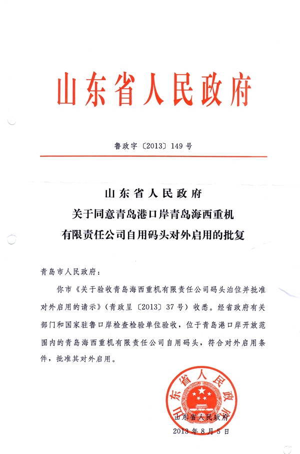 省政府同意公司自用碼頭對外啟用的批復
